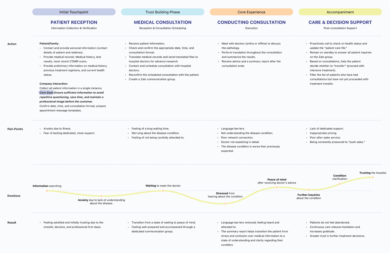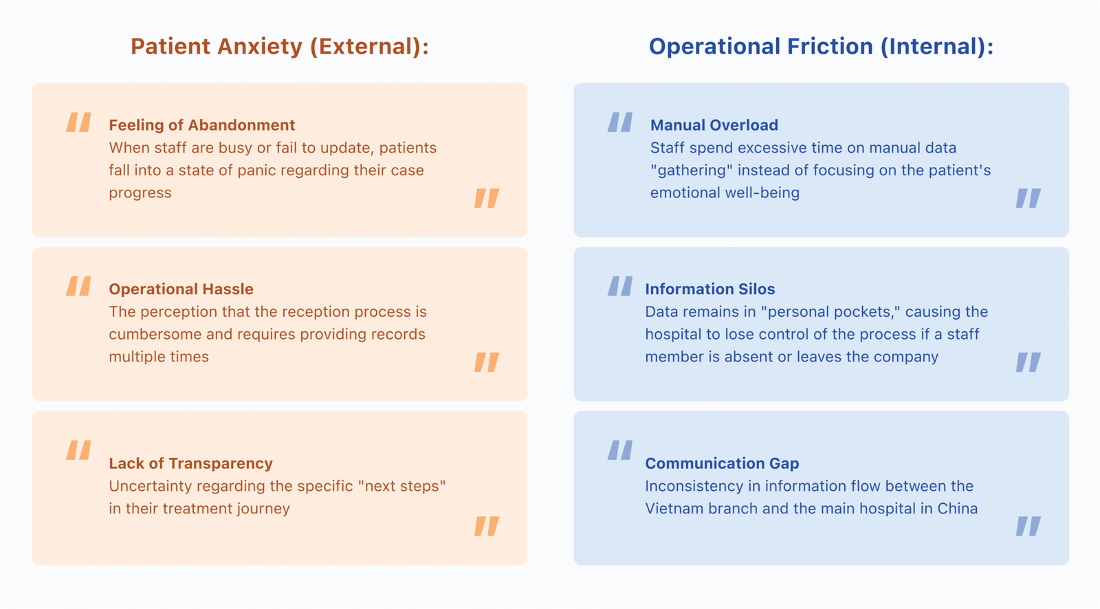 Lack of Synchronization: The reception process relies heavily on the individual skills and memory of Sales/Consultancy staff. Information is fragmented across Zalo and personal notes, leading to “gaps” in care during staff transitions.